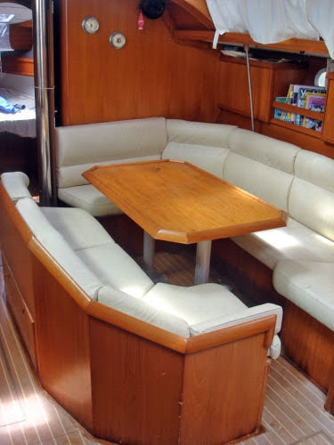 Eset has 3 double cabins with dinette seating which folds out to become an extra double bed in the salon.Her main advantage is her variable bow cabin. The forward bulkhead can be set up as a single bed or two bunk beds, and the forward cabin, by moving a bulkhead, can be set up as two separate cabins, or a family suite.