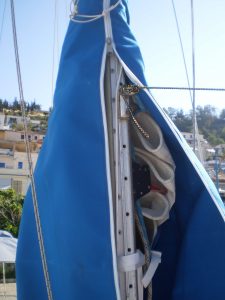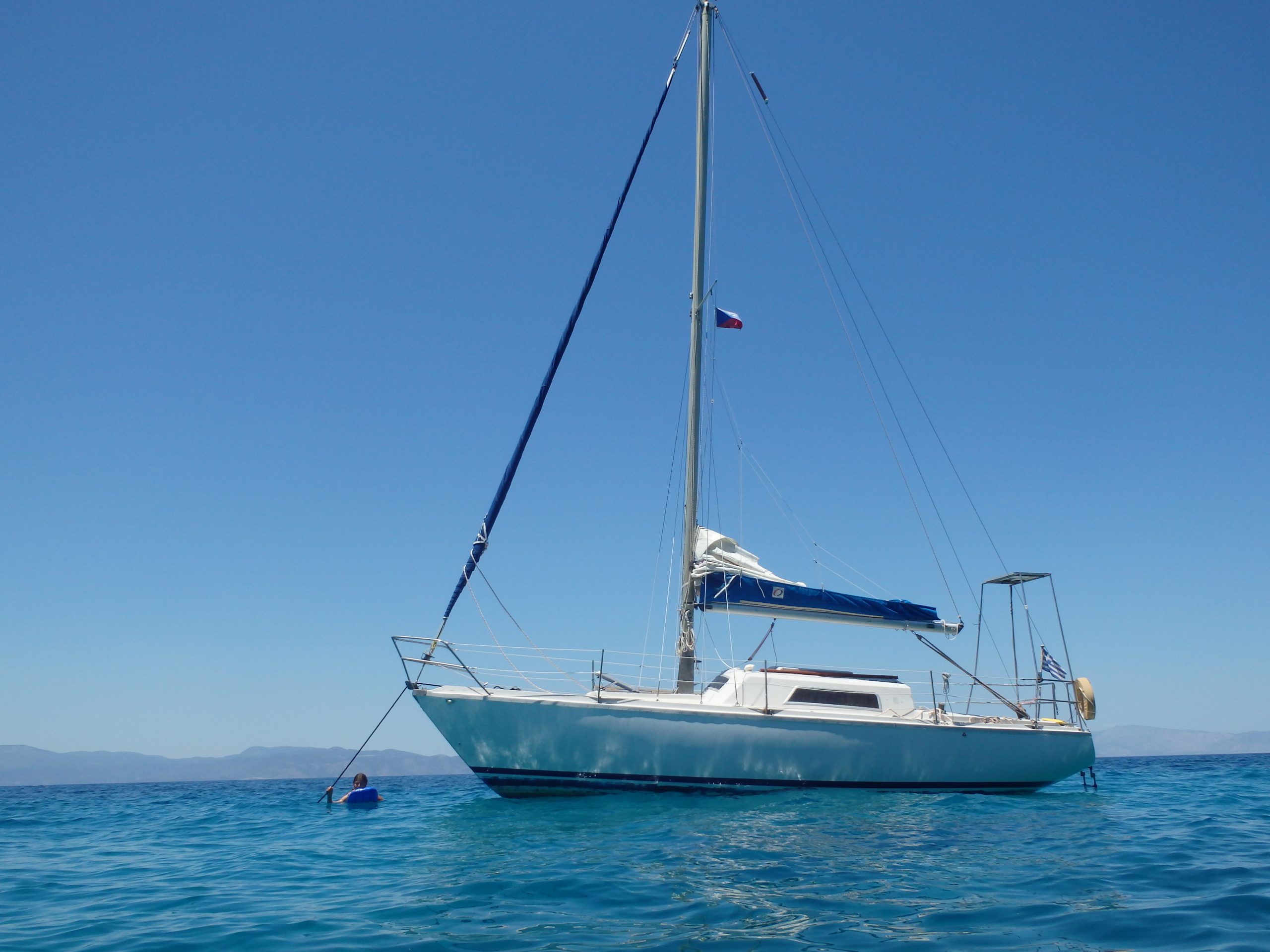 She has a full reef main sail , folding into a lazy bag. Furling Genoa, Garmin GPS on board, depth gauge, speedometer, no autopilot, VHF with DSC, EPIRB. Tiller control. Fuel tank 80 l, water tanks 1 x 120 l. Life preserver, vests, safety harnesses. Separate leisure and engine batteries. Pillows, blankets and sheets are included.